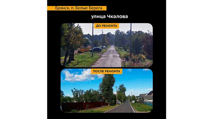 В поселке Белые Берега Фокинского района Брянска по национальному проекту «Безопасные качественные дороги» летом капитально отремонтировали автодорогу по улице Чкалова. Дорогу обновили на участке более 600 метров от улицы Вокзальной до переулка Калинина. Обустроено новое асфальтобетонное покрытие, тротуары и электроосвещение, установлены дорожные знаки, нанесена разметка, сообщает в соцсети ВК управление автомобильных дорог Брянской области.