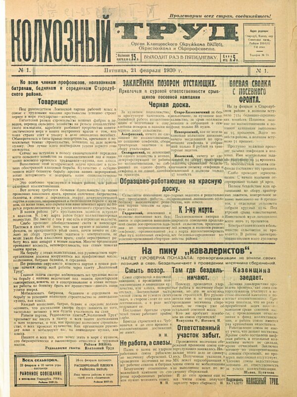 Первый номер под названием «Колхозный труд» вышел в свет 21 февраля 1930 года. Газета печаталась два раза в пятидневку на двух полосах и поднимала на своих страницах немало актуальных в то время тем, поддерживая, подбадривая, увлекая за собой. Словом, звала в прекрасное будущее, до которого, судя по содержанию, — рукой подать! Она то уверенно шла «В атаку на классового врага», то — «С массами вперёд!», а то, к примеру, заявляла, что «В Невзоровской школе притаился классовый враг», пыталась «Разогнать кулацкий сельсовет», выгнать вон «лишенцев». Твёрдо уверяла — «Кулаков ликвидируем», «Возложенные задачи выполню», «Доверие оправдаю», призывала «К ответу срывщиков», а ещё клеймила позором «невзоровских лежабок» и «делягу Зайцева». И это ещё не весь список названий опубликованных на её страницах статей. Словом, трудилась районка в те годы даже не на 100, а на все 200 процентов! Впрочем, как и вся страна, область, район – не просто гордо, с оптимизмом, а даже с творческим порывом и надрывом. Нашим коллегам приходилось трудно, и они, вне всякого сомнения, в полной мере ощутили веяние того времени на себе. Однако, благодаря таланту и неустанному самоотверженному труду, им удалось пройти свой путь достойно, чтобы сегодня, разглядывая тот самый, первый, выпуск, мы, современные работники редакции, смогли почувствовать нерушимую временную связь поколений.