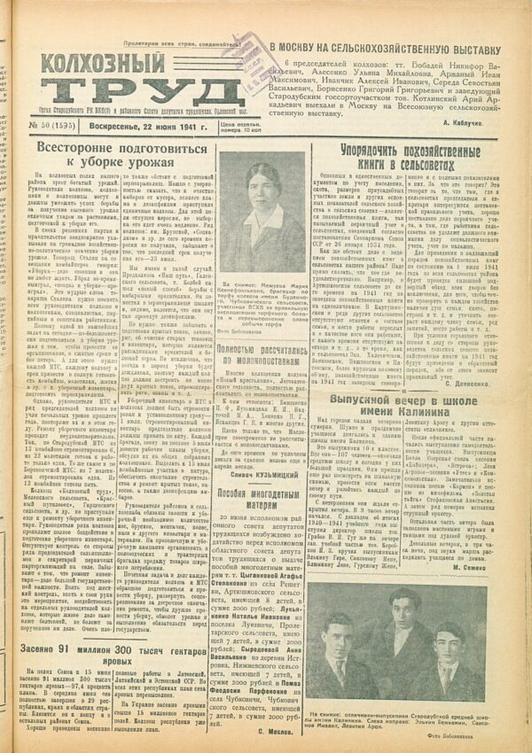 Газета «Колхозный труд». Воскресный номер от 22 июня 1941 года. На первой полосе — заметка о выпускном вечере в школе им. Калинина. Также наши коллеги-журналисты рассказывают о шести председателях колхозов, которые поедут на сельскохозяйственную выставку в Москву и многом другом. Есть ещё небольшая информация о том, что «25 и 26 июня демонстрируется звуковой художественный фильм «Василиса Прекрасная». Посмотрел ли кто-нибудь этот фильм или, возможно, было уже не до того, ведь следующий номер газеты вышел буквально 23 июня, в котором всю первую полосу занимает выступление по радио заместителя председателя Совнаркома СССР и народного комиссара иностранных дел В. М. Молотова 22 июня 1941 года. Здесь же размещены указы Президиума Верховного Совета СССР о мобилизации военнообязанных, родившихся с 1905 по 1918 год включительно, и об объявлении в отдельных местностях СССР военного положения, включая и Орловскую область, к которой в то время относился Стародубский район. «Около 400 человек колхозников и колхозниц собрались в Яцковичском сельсовете на митинг, посвящённый выступлению тов. Молотова в связи с наглым нападением германских фашистов на нашу страну», — такими словами начинается заметка «Если надо, все как один пойдём на защиту нашей Родины».