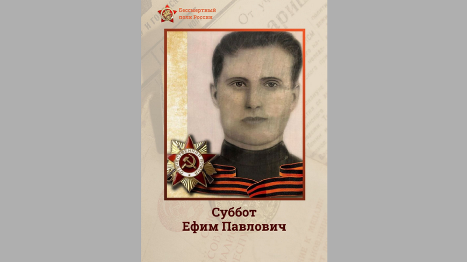 Ефим Павлович Суббот уроженец д. Суховерхово Стародубского района. Получил профобразование, до войны работал на железнодорожном транспорте. Е. П. Суббот погиб в бою за Мосальский район Калужской области.